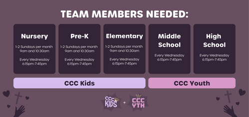 If you're interested in any of these roles- please fill out the form below or reach out to our Family Ministry Pastor Rachael at rachael@ccc-kasson.org